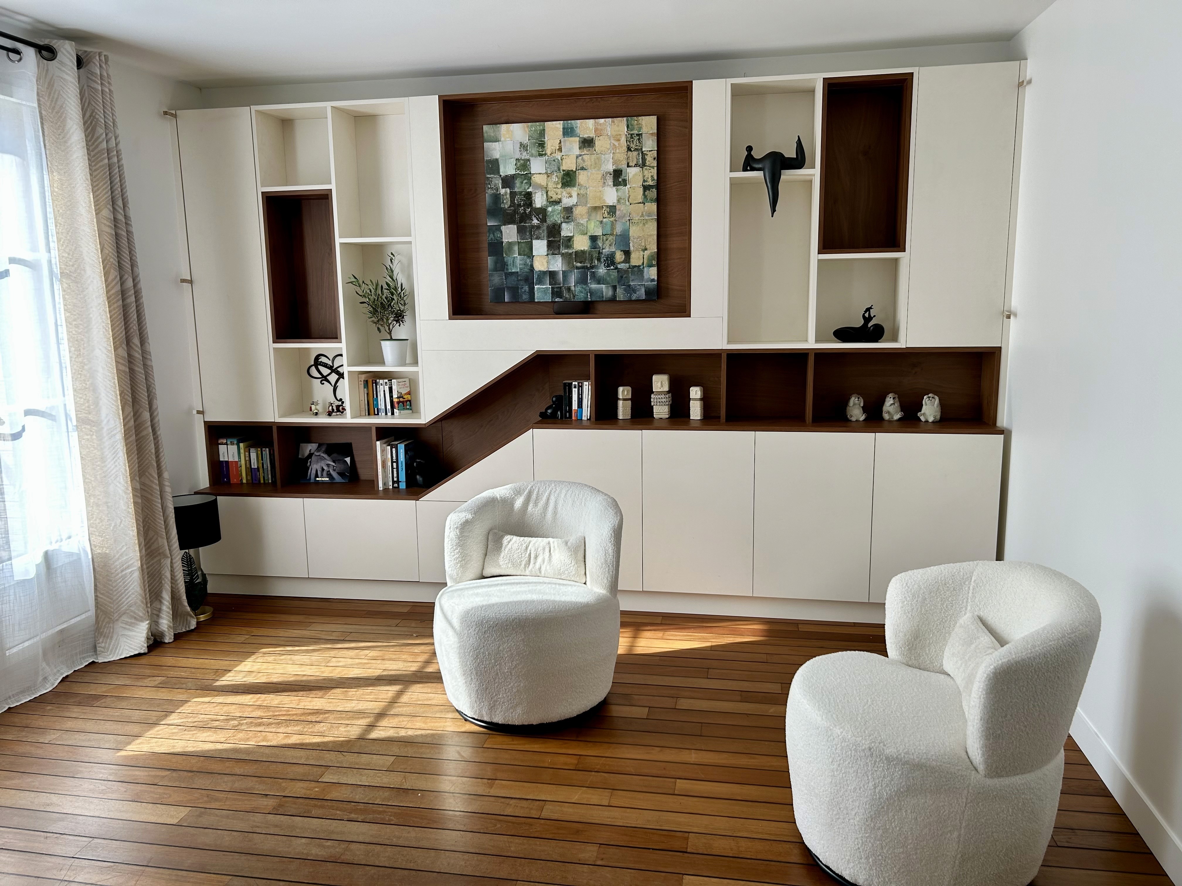 Excellente expérience. Nous sommes plus que ravie de notre bibliothèque qui dissimule très subtilement notre télévision. Elle s’intègre parfaitement dans notre intérieure.Le travail de menuiserie est très bien réalisé.Nous ne pouvons que vous recommander cette professionnelle pour sublimer vos espaces.