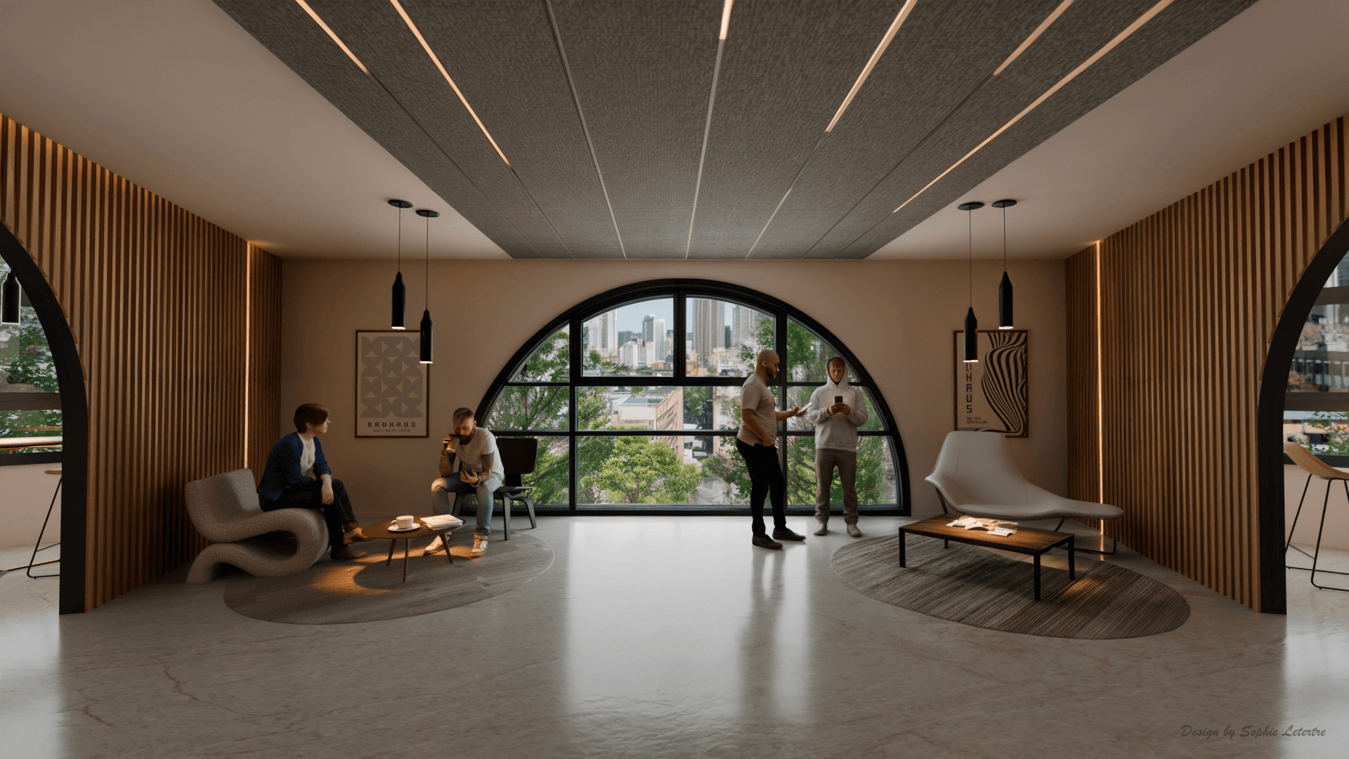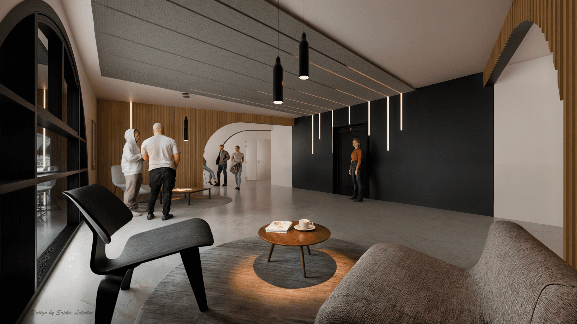 Conception d’espaces d’accueil et de circulation au sein d’un bâtiment de bureaux, pensés comme des lieux de rencontre et de respiration. Le projet joue sur les courbes, les matières et la lumière pour créer une atmosphère apaisée, fluide et accueillante. Un clin d'oeil élégant aux coursives du bâtiment.