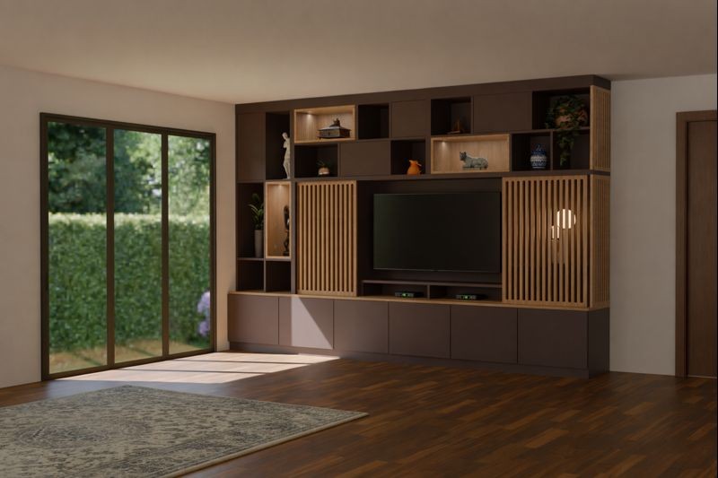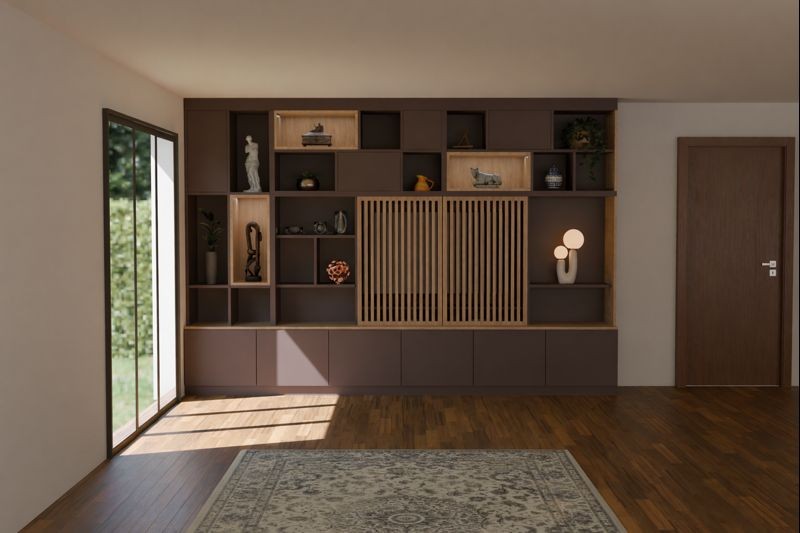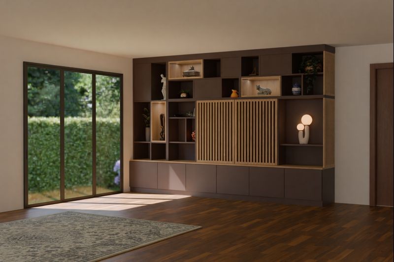 Conception d’une bibliothèque et meuble TV sur mesure. Le jeu de claustras bois, de niches ouvertes et de volumes fermés structure le mur tout en apportant chaleur, rythme et fonctionnalité à l’espace de vie. Un projet d’architecture d’intérieur alliant design, confort et optimisation des usages.