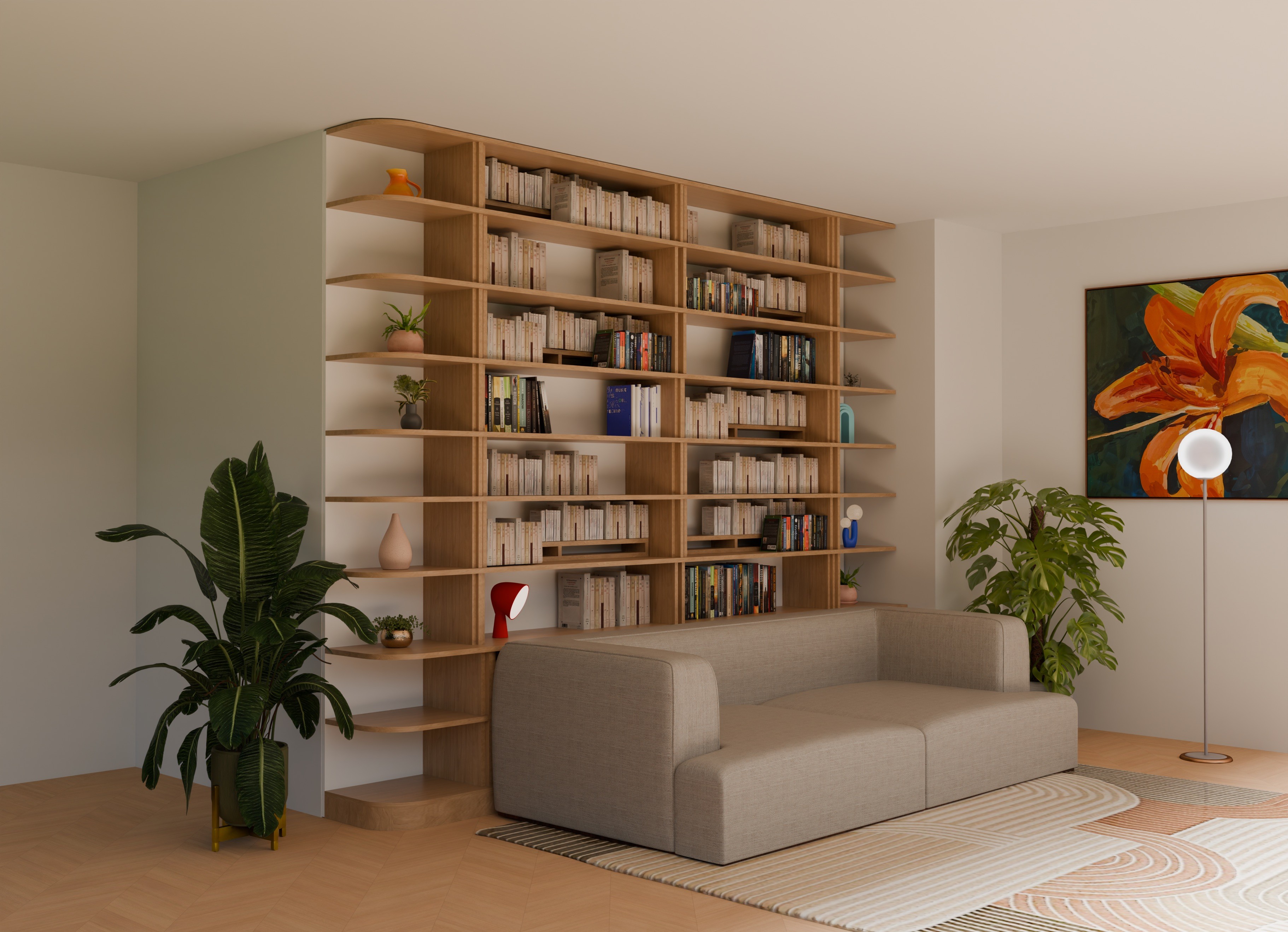 Déployée du sol au plafond, cette bibliothèque en bois sur mesure s’inscrit parfaitement dans son environnement et devient un véritable décor de vie. Plus qu’un meuble de rangement, elle constitue un espace dédié à la lecture, à la création et à la mise en scène des livres, pensé spécifiquement pour un passionné de littérature.